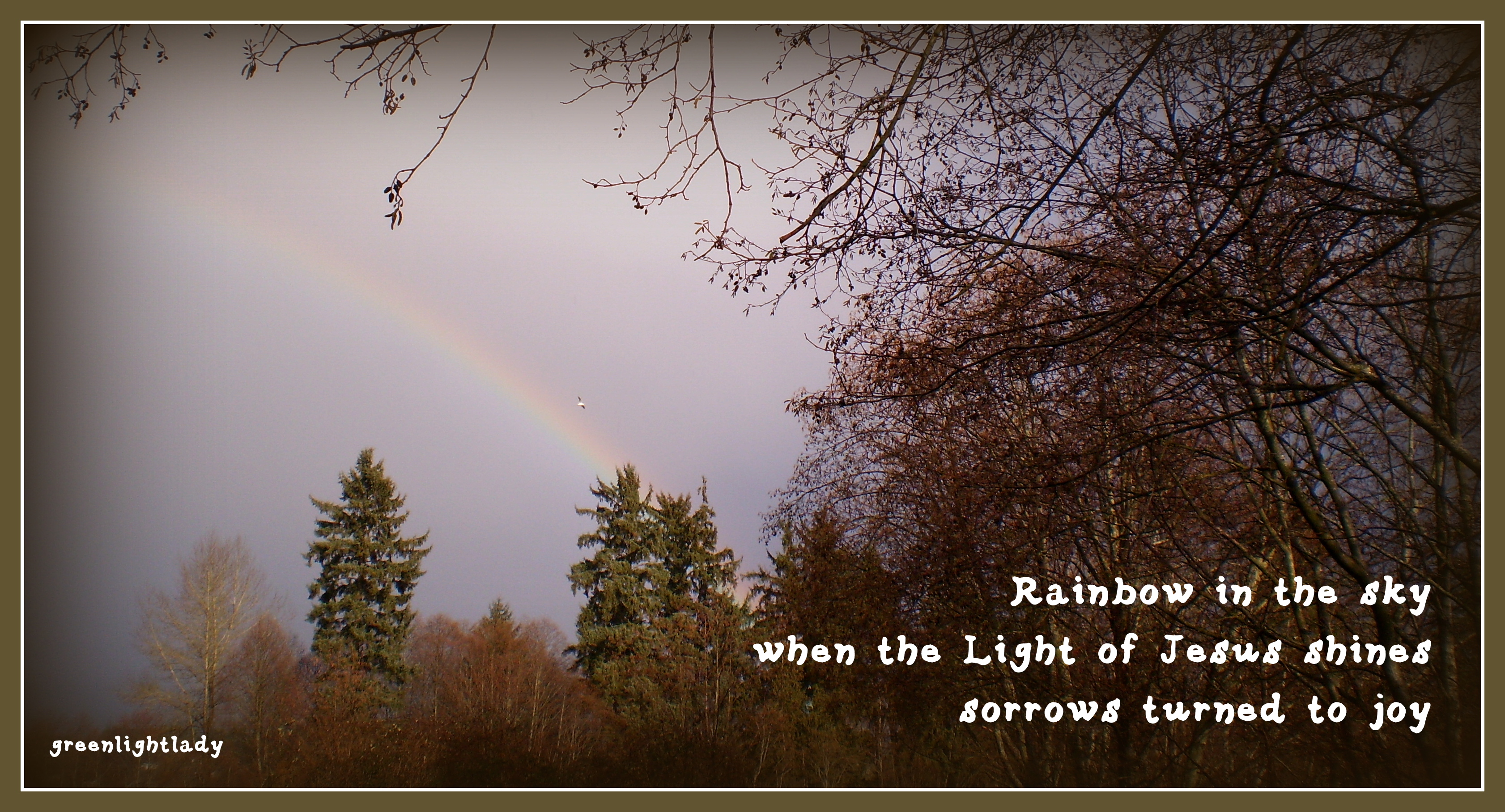 Sue, I love your haiku. It would go perfectly with a picture of a child clad in a yellow raincoat, yellow boots, and a rainbow umbrella (splashing through a huge puddle–of course). Thank you for your blessing. ❀ “Christ in us–the Hope of glory.”
